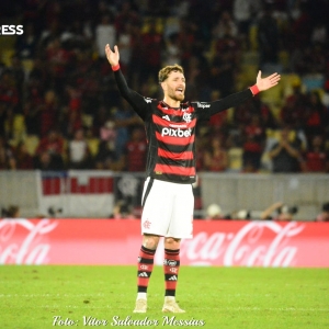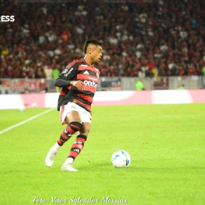 Após escanteio cobrado por Luis Araújo, Bruno Henrique faz de cabeça, decidindo para o Flamengo, e garantindo a vantagem para o jogo de volta.