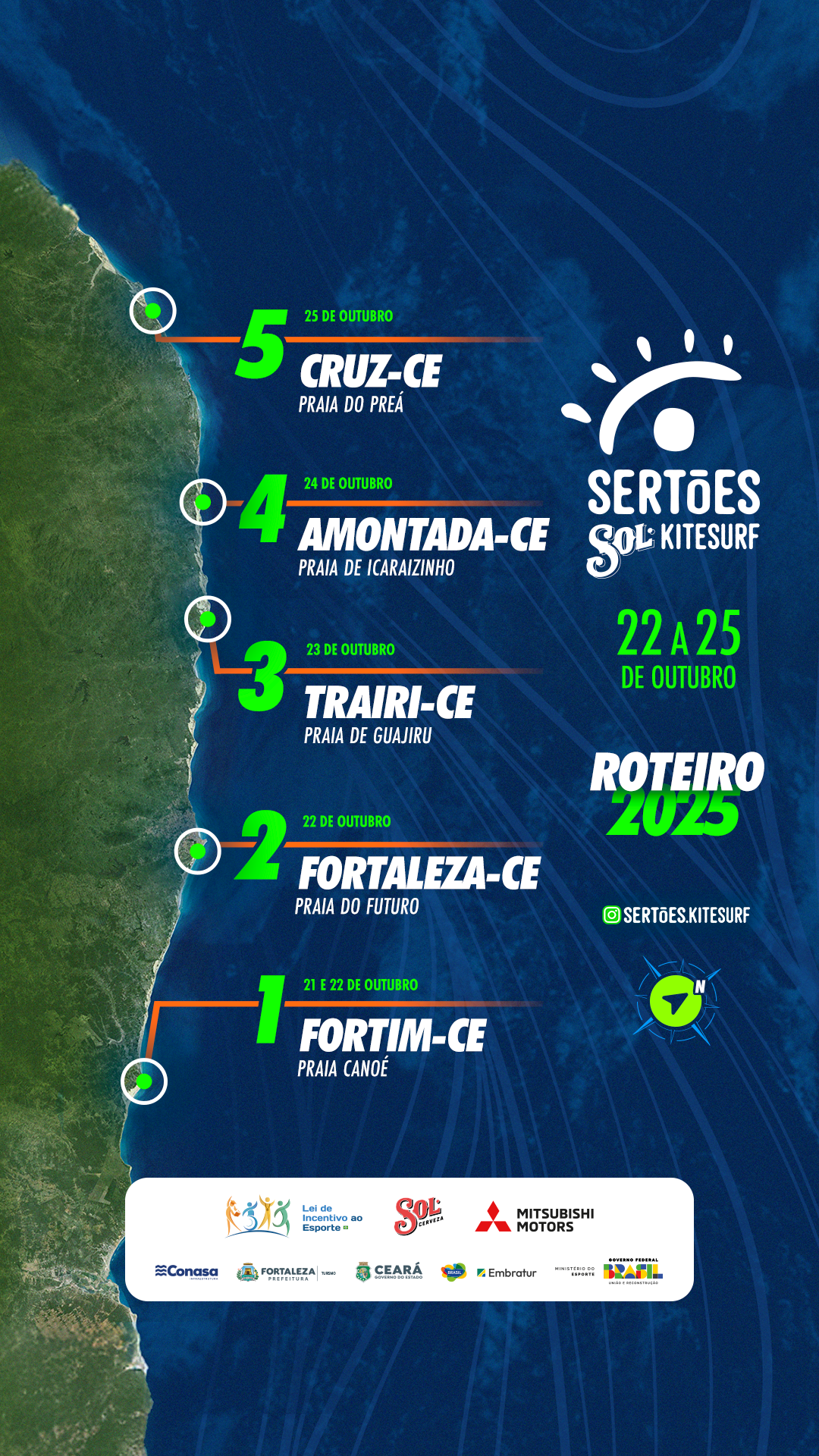 Faltam três semanas para a largada da quinta edição do maior rally de kitesurf do planeta. De 22 a 25 de outubro, o litoral cearense volta a receber o Sol Sertões Kitesurf, em um roteiro que ligará Fortim ao Preá (Cruz), com Fortaleza, Trairi e Amontada como cidades intermediárias. Neste ano, a prova, que integra os calendários oficiais da Confederação Brasileira de Vela (CBVela) e da Associação Brasileira de Kitesurf (ABK), traz atrativos extras que prometem esquentar a disputas nas diferentes categorias. Os vencedores levarão para casa o título brasileiro da modalidade Rally Cross, que inclui a travessia de trechos terrestres. Além disso, no penúltimo dia, atletas das categorias Pro e Elite farão uma regata válida pelo Brasileiro de TT Race. Entre os nomes já confirmados está o do maranhense Bruno Lobo, representante brasileiro na estreia olímpica do esporte, nos Jogos de Paris 2024.