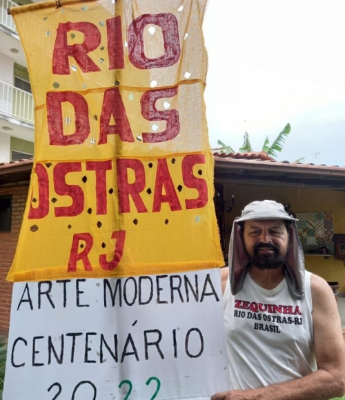 Zequinha leva a faixa com o nome de Rio das Ostras enquanto corre pela Avenida Paulista